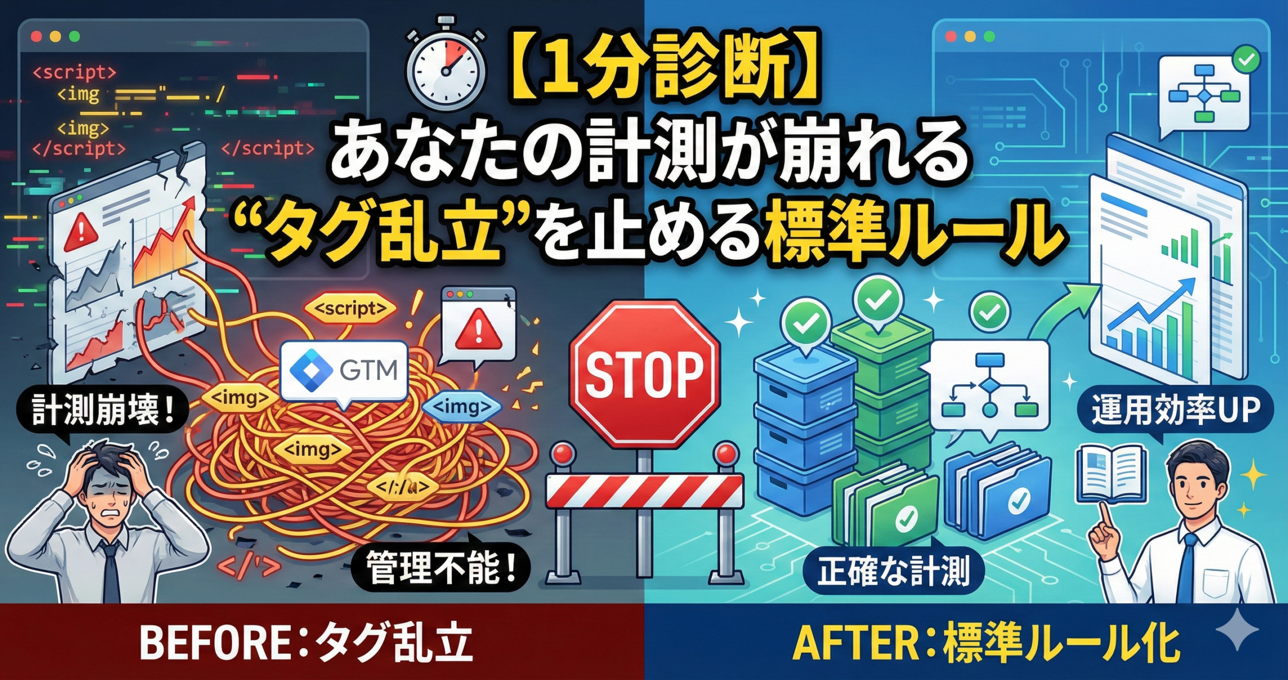 本記事は、デジタルマーケティング担当者がチームで使えるように、タグ乱立を止めるための“標準ルール”を、診断→設計→導入の順に整理します。