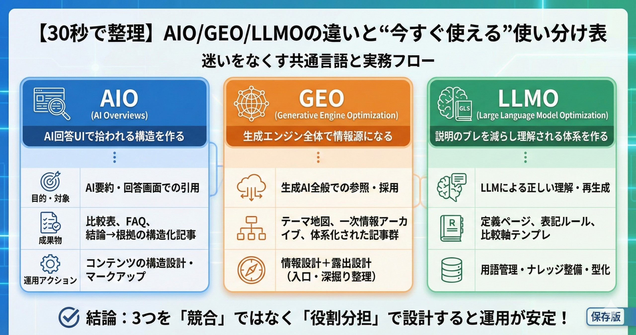 【30秒で整理】AIO/GEO/LLMOの違いと“今すぐ使える”使い分け表