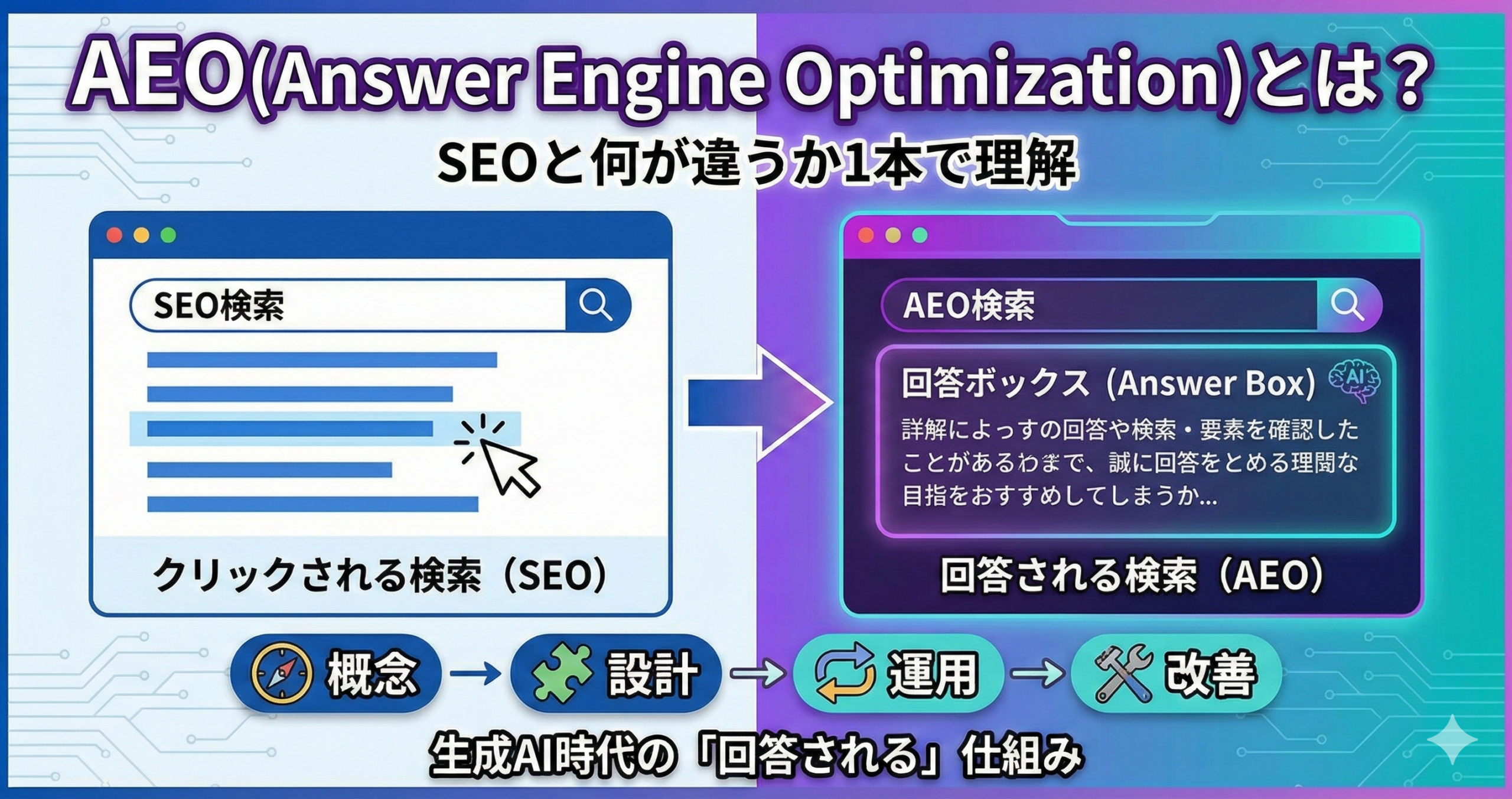 この記事ではAEO(Answer Engine Optimization)の考え方を、概念→設計→運用→改善の順で、明日からの実務に落とせる形に整理します。