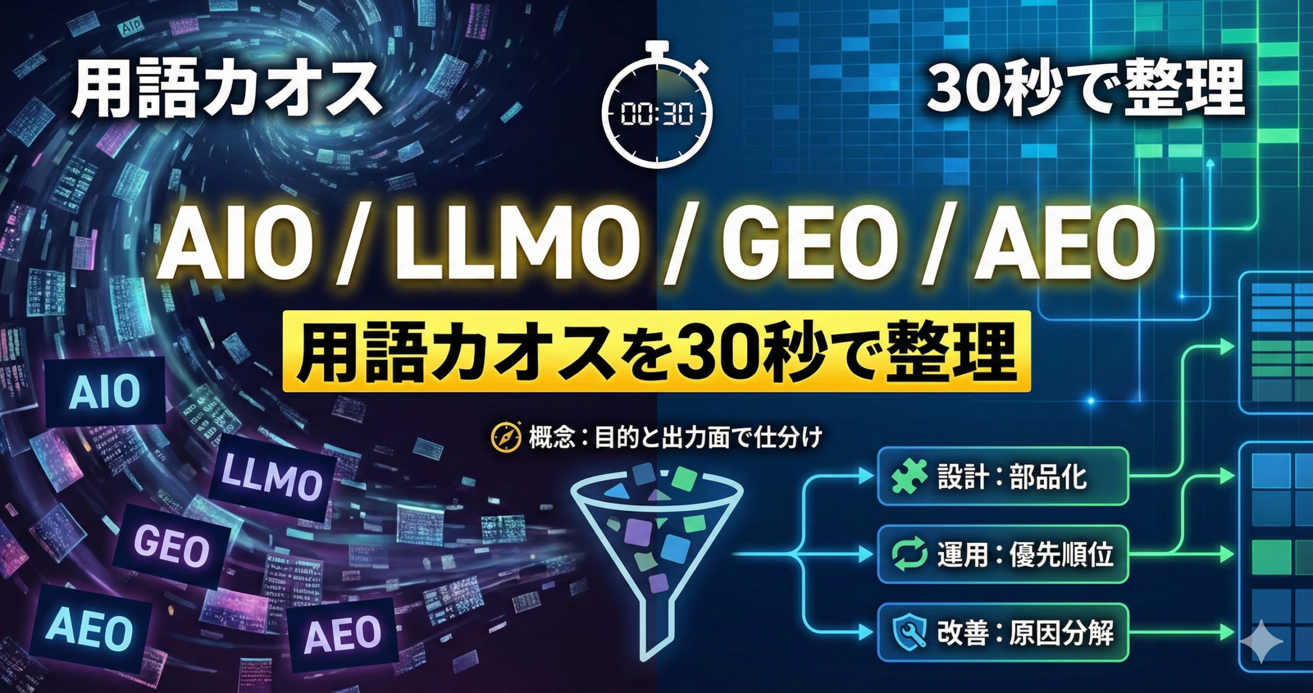 本記事では、AIO/LLMO/GEO/AEOを「何を変える話か(出力面)」と「どこで回す話か(工程)」に分けて整理します。