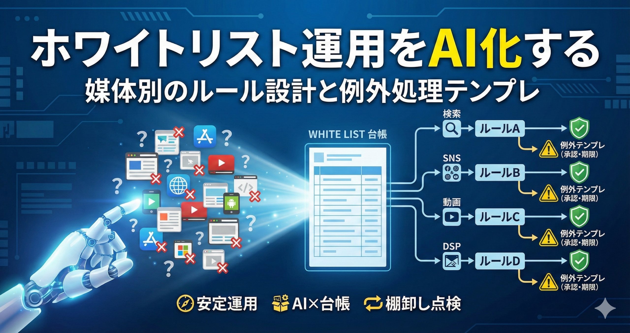 ホワイトリスト運用をAI化する:媒体別のルール設計と例外処理テンプレ