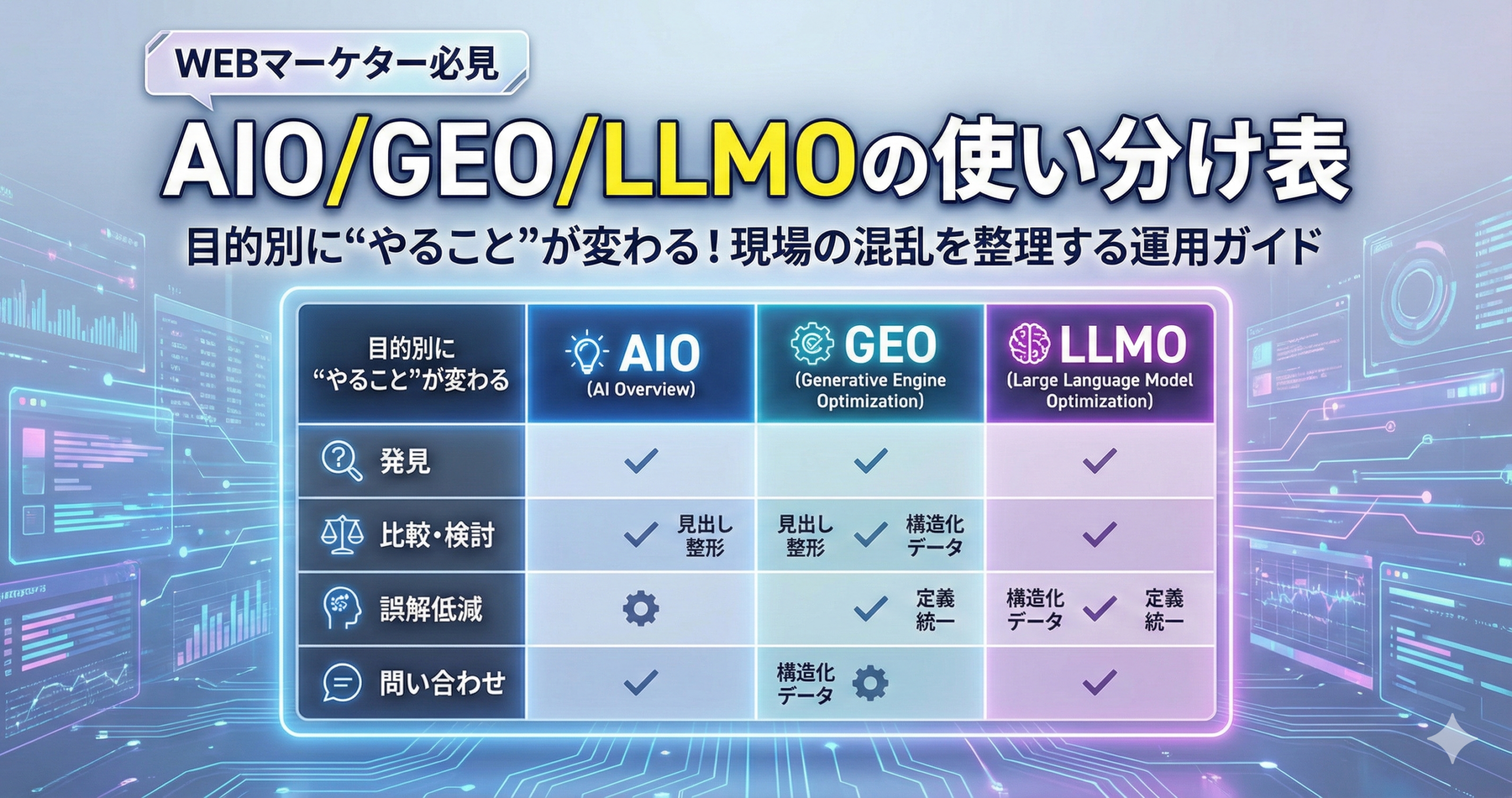 本記事では、目的と評価軸を起点に、AIO/GEO/LLMOで“やること”がどう変わるかを、使い分け表と運用ルールとして整理します。