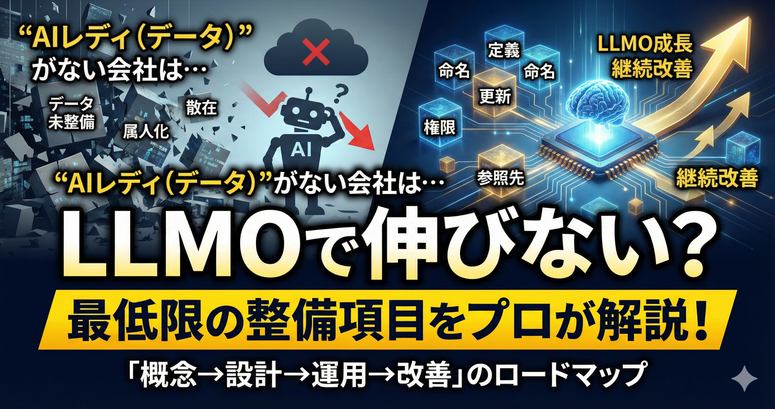 ここで言う「AIレディ(データ)」は、単にデータ量が多い状態ではありません。意味が揃い、更新でき、参照でき、説明できる状態のことです。これが弱いと、LLMOの改善が“点”で終わりやすく、運用として積み上がりにくくなります。