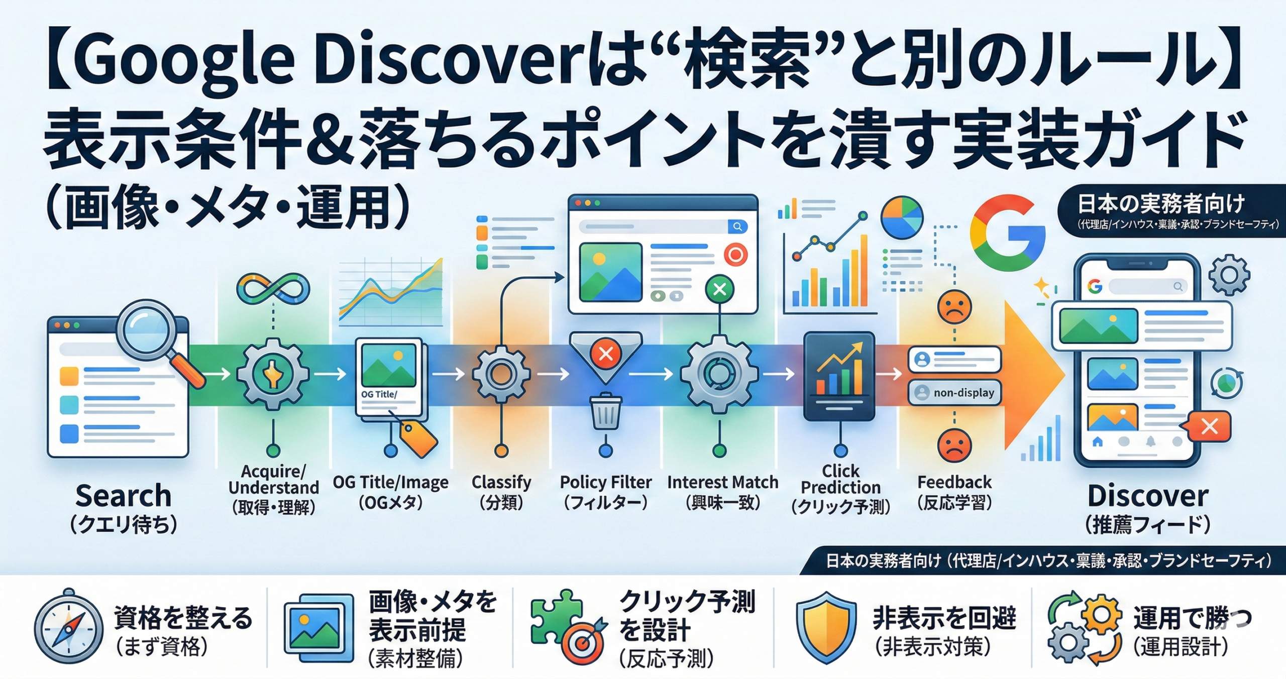 【Google Discoverは“検索”と別のルール】表示される条件と落ちるポイントを潰す実装ガイド(画像・メタ・運用)
