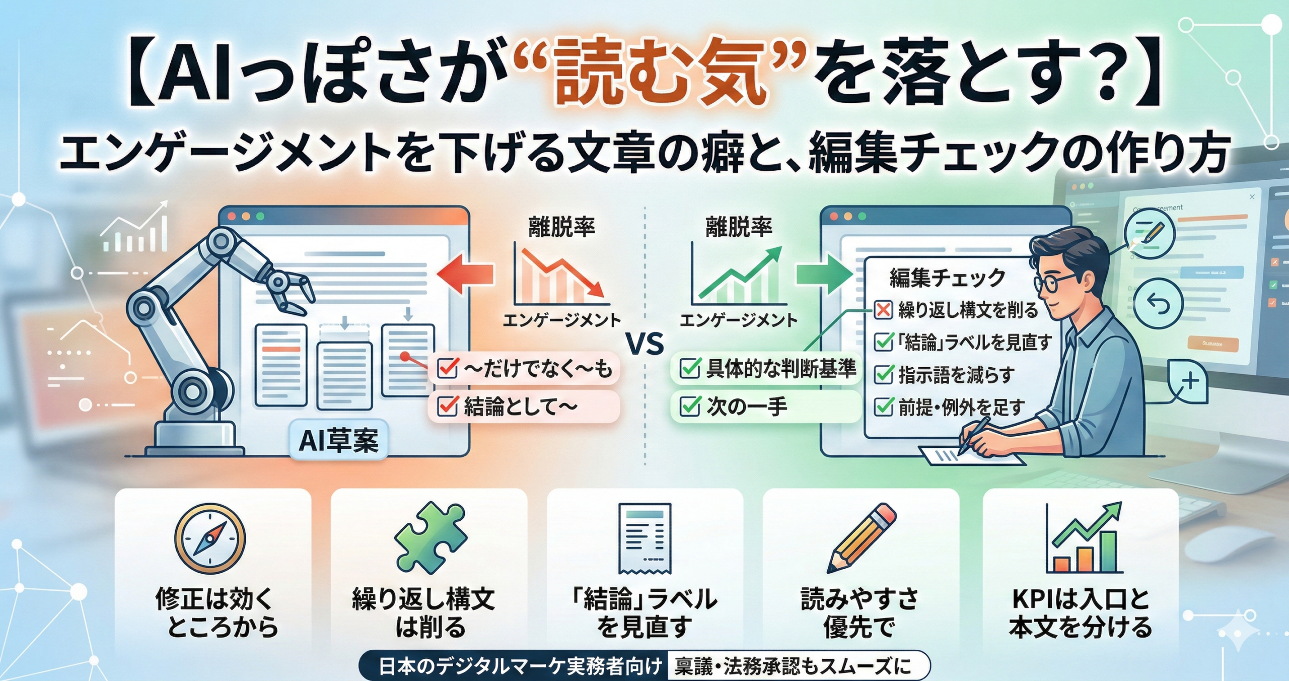 【AIっぽさが“読む気”を落とす?】エンゲージメントを下げる文章の癖と、編集チェックの作り方