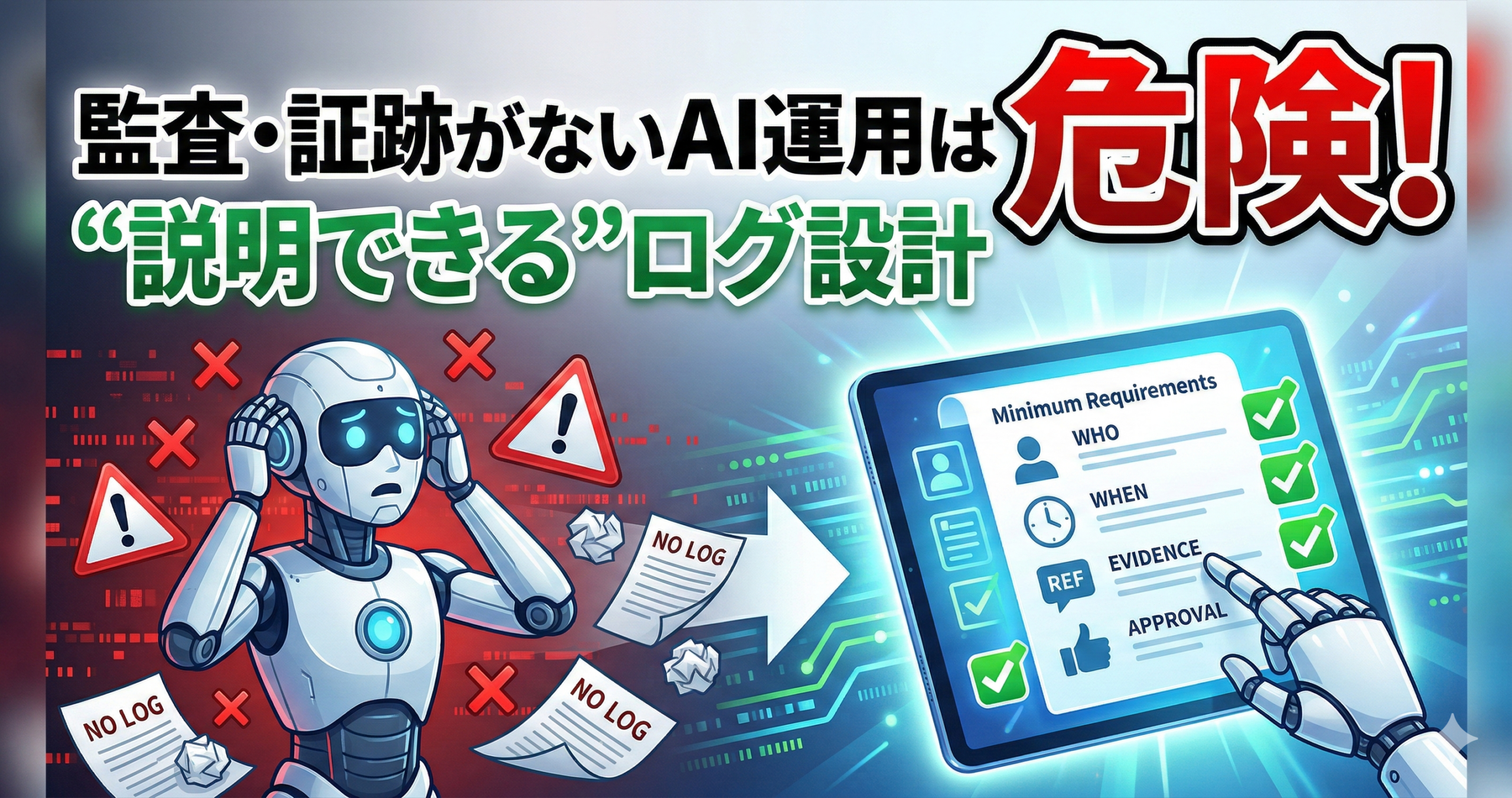 🖼️ 画像案プレースホルダ:チェックリスト(提出→AI→例外→承認→事後)に「ログ必須」スタンプを押した図