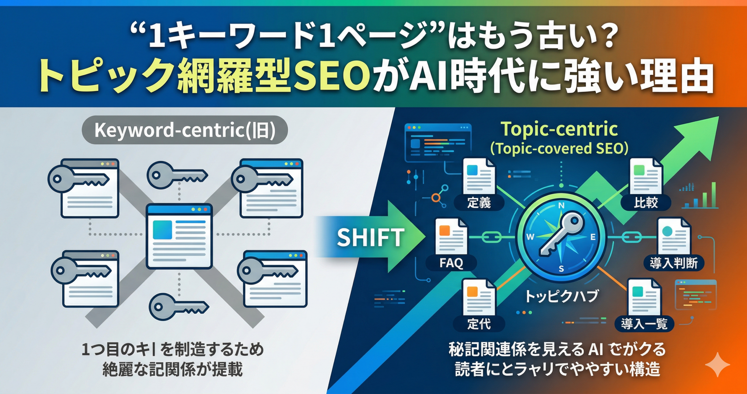 結論として、“1キーワード1ページ”の発想だけに頼るより、主題ごとに答えを整理したトピック網羅型の方が、AI時代の運用にはなじみやすくなりやすいです。