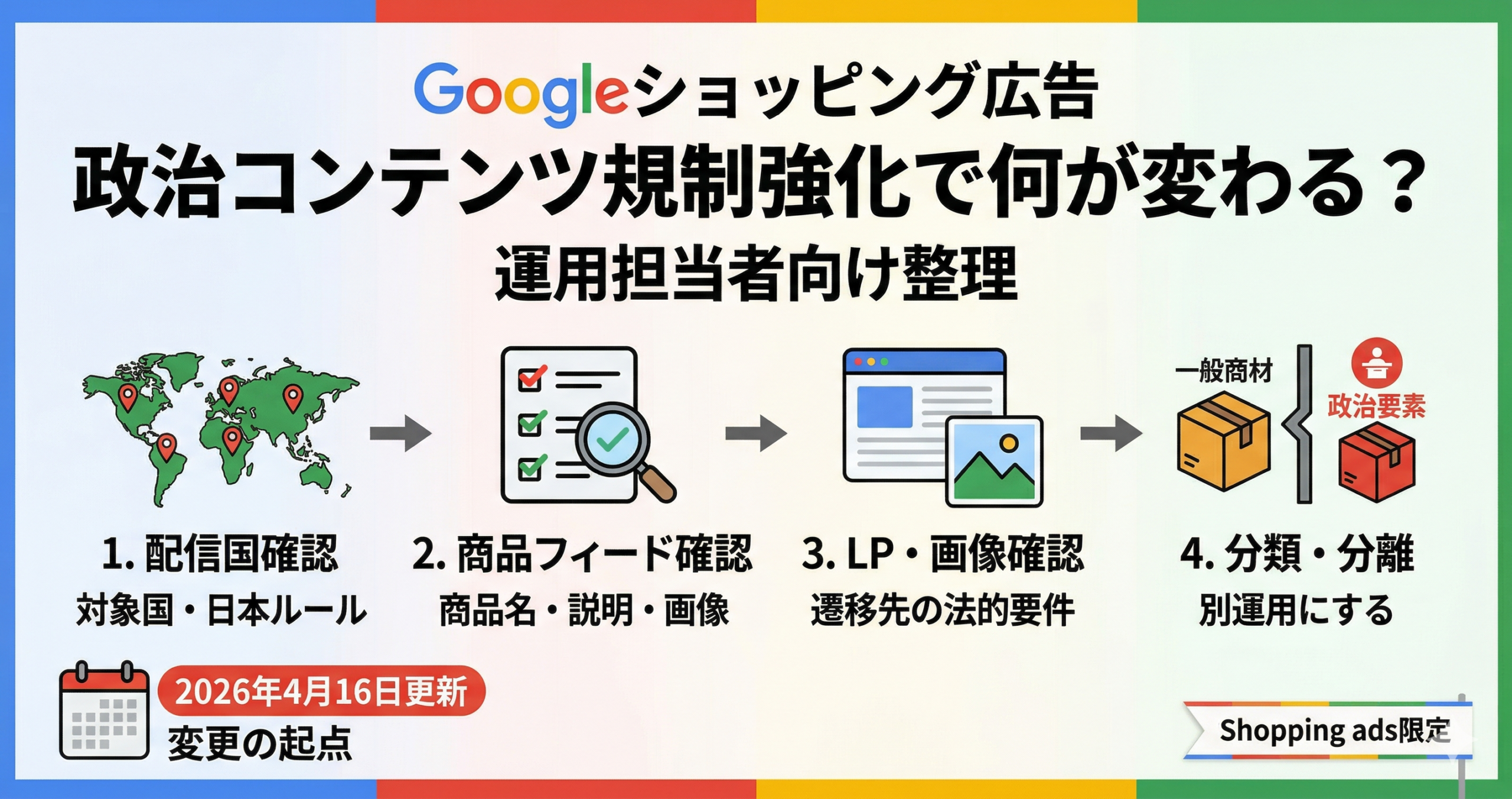 Googleは2026年3月の告知で、4月16日にShopping adsの政治コンテンツポリシーを更新すると案内しています。対象はShopping adsです。