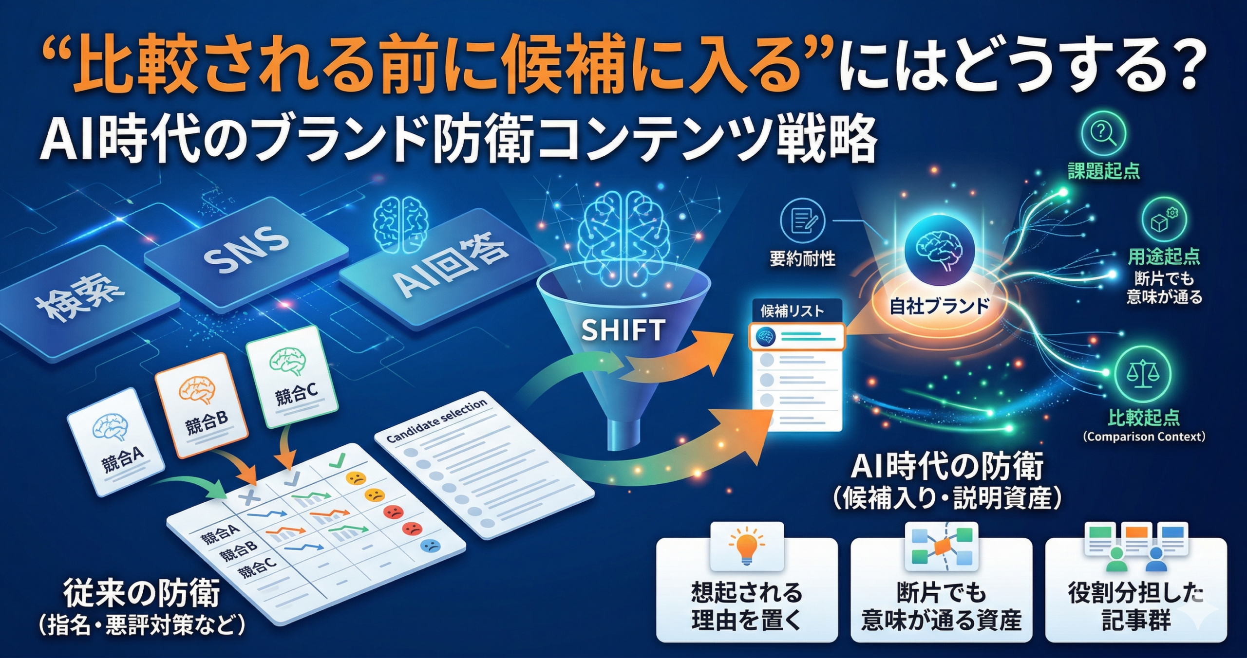 この記事では、AI時代のブランド防衛を、単なる評判対策や指名検索対策としてではなく、「比較前の候補入り」を支えるコンテンツ戦略として整理します。概念、設計、運用、改善まで一続きで説明し、明日からの実務に落とせる粒度まで具体化します。