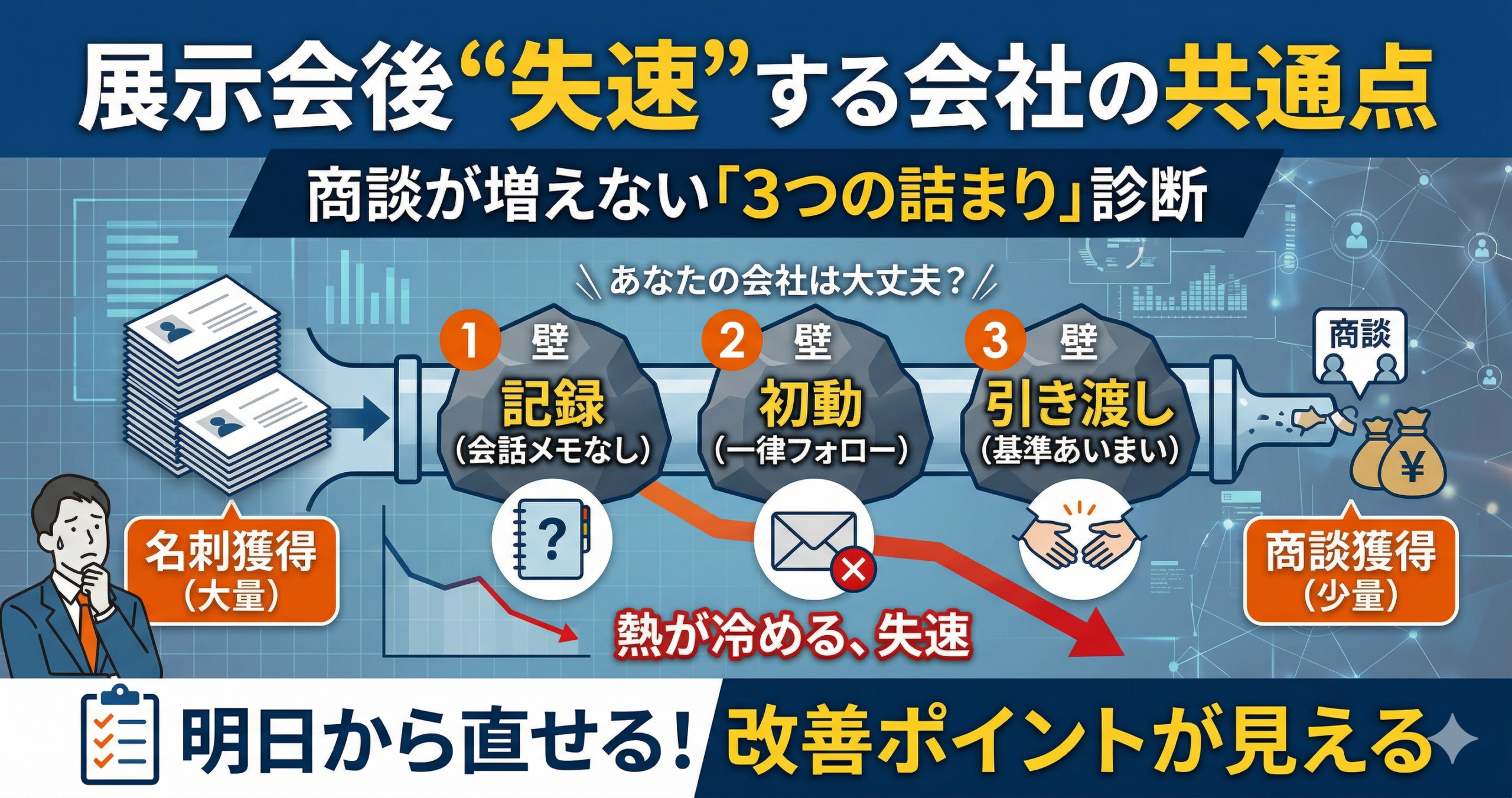 結論として、展示会の成果を商談へつなげるには、名刺の量を追うだけでなく、会期後の流れのどこで止まっているかを診断することが必要です。