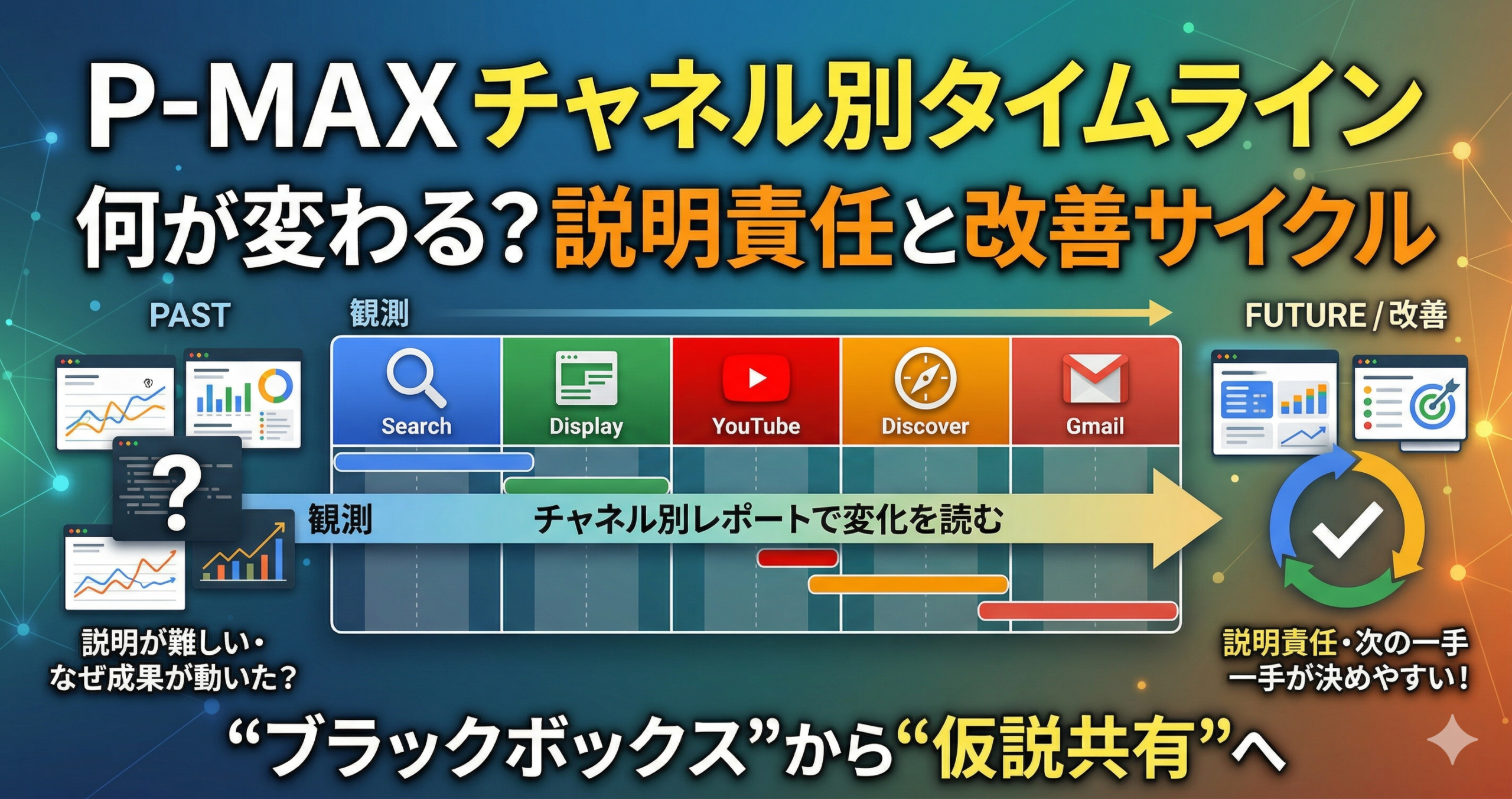 本記事の主な問いは次の通りです。P-MAXのチャネル別タイムラインとは何を意味するのか。何が見えるようになり、何を誤解しやすいのか。説明責任はどう変わるのか。改善サイクルはどう組み直すべきか。この順番で整理していきます。