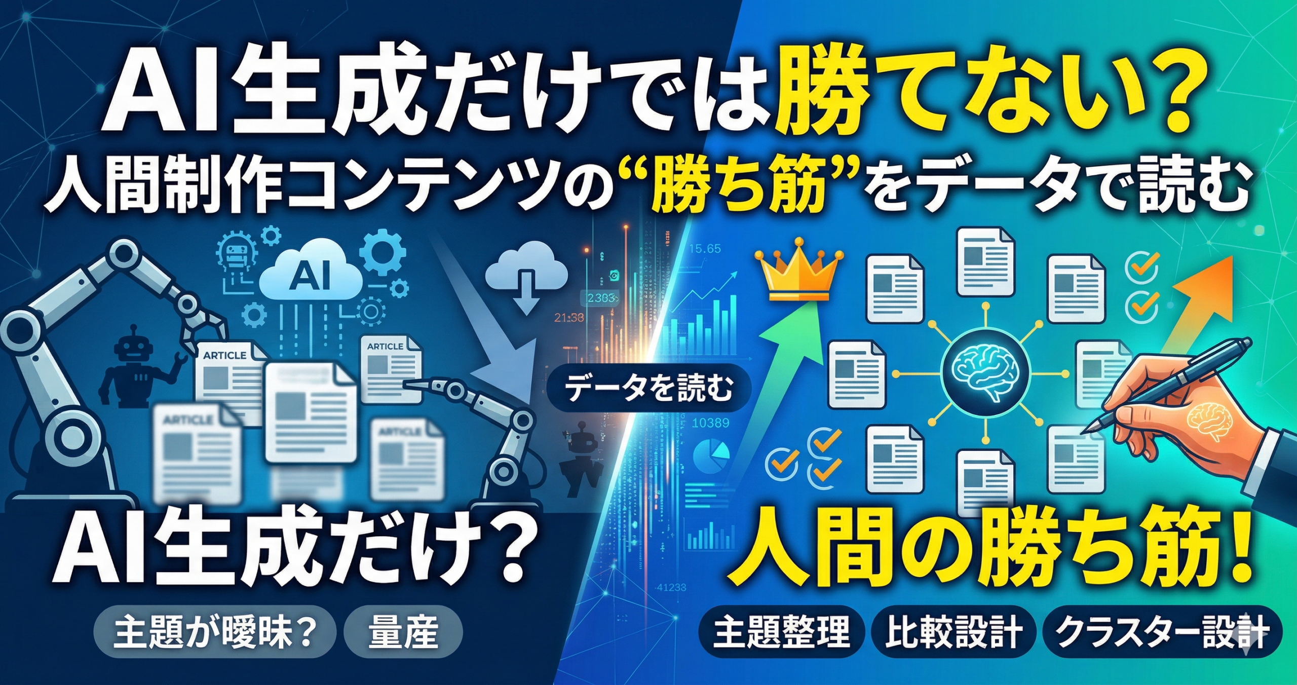 AIで記事を作れる時代に、なぜ人間制作の価値が残るのか。どこに差が出るのか。何を人が担い、何をAIに任せると運用が整いやすいのか。本記事では、概念 → 設計 → 運用 → 改善の順で整理します。