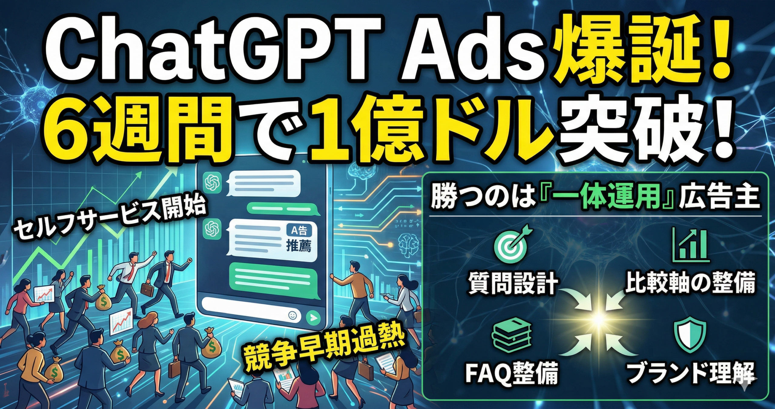 ChatGPT Adsが6週間で1億ドル突破:4月セルフサービス開始が広告主に与える機会と競争激化