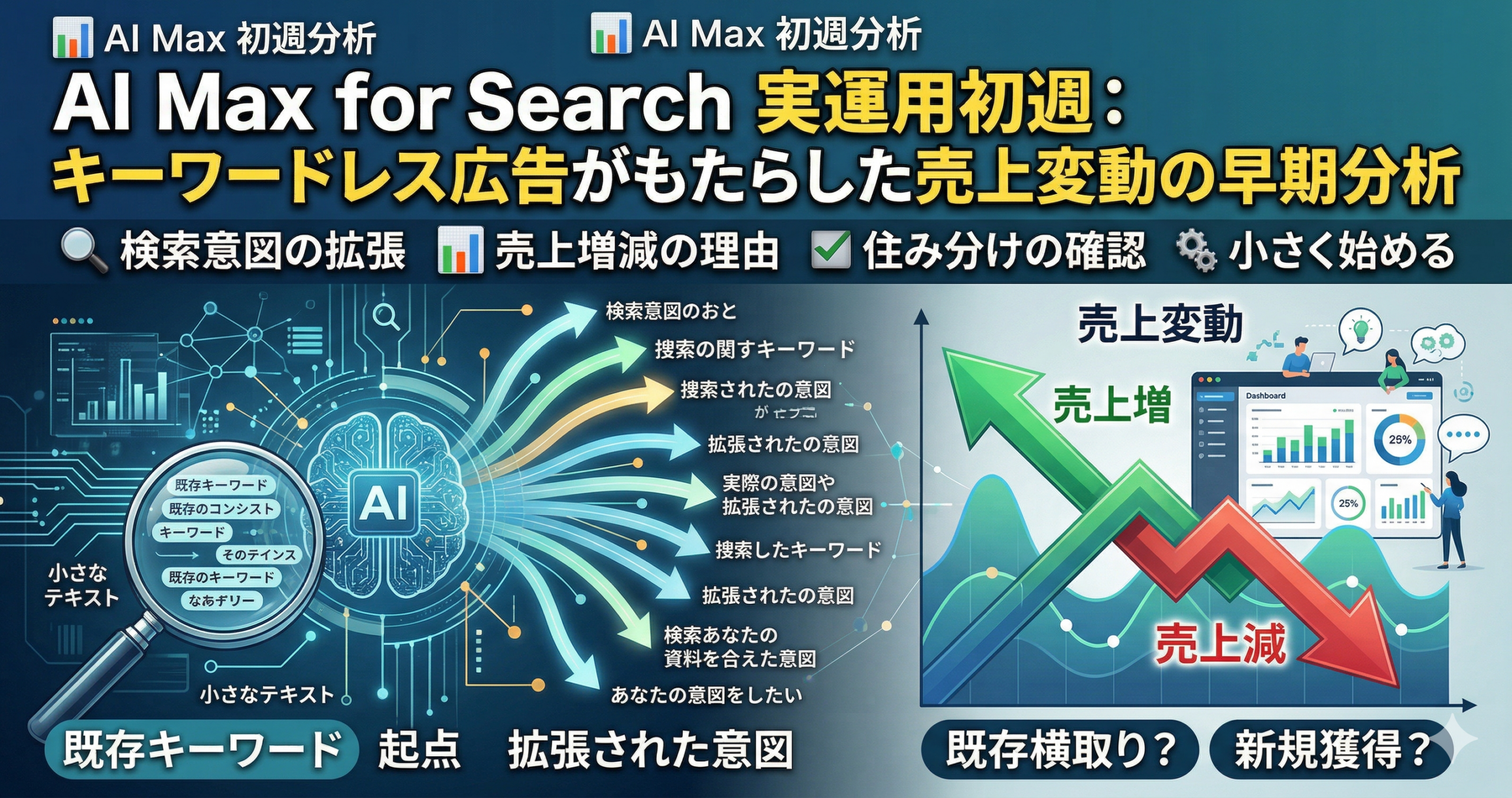 この記事では、AI Max for Searchを実運用に入れた最初の一週間を想定し、売上変動をどう読めばよいか、キーワードレス広告をどのように理解すべきか、どの順番で改善を進めればよいかを、概念→設計→運用→改善の流れで整理します。早期分析の目的は、短期の勝ち負けを急ぐことではなく、再現可能な運用ルールをつくることです。