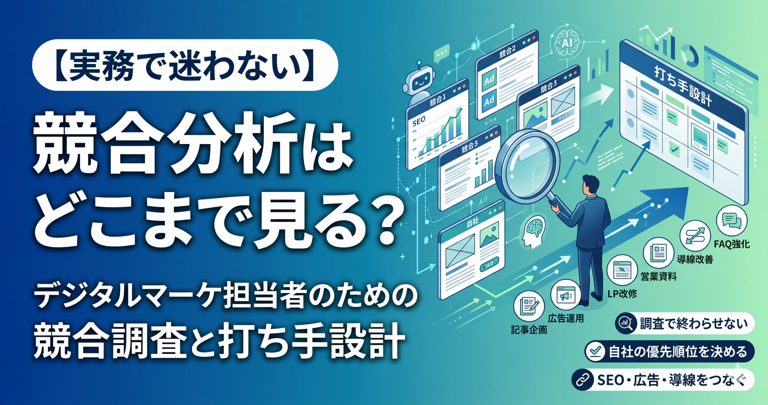 競合分析は、順位や広告文を眺める作業で終わらせると使い切れません。重要なのは、誰と比べるかを定義し、検索・広告・訴求・導線・営業連携までをひとつの判断材料としてつなぎ、次の施策へ落とすことです。この記事では、競合分析を「資料作成のための調査」ではなく、「実務を動かすための運用設計」として整理します。