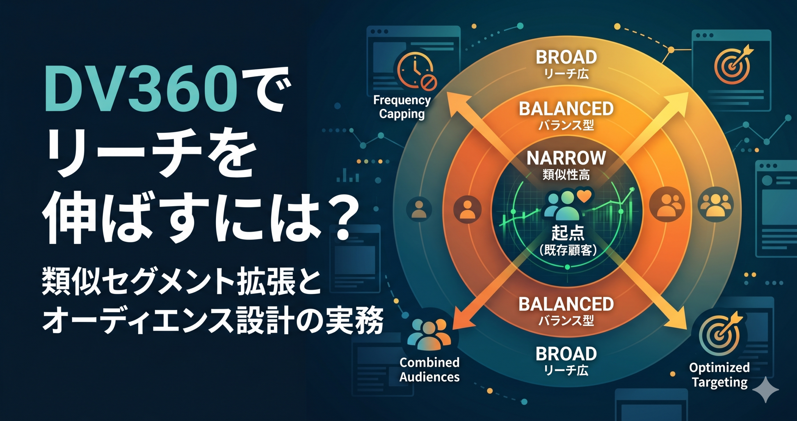 結論からいうと、DV360でリーチを伸ばすには、狭いオーディエンスを単純に広げるのではなく、起点となるセグメントの質、拡張幅、配信目的、頻度、除外条件をセットで設計することが重要です。2026年4月時点でDV360では、Lookalike audiencesにより既存顧客と似た属性を持つ新しいユーザーへ接点を広げる機能が案内されており、narrow、balanced、broadの選択肢で類似性とリーチのバランスを調整できます。([support.google.com](https://support.google.com/displayvideo/answer/15612398?hl=en))