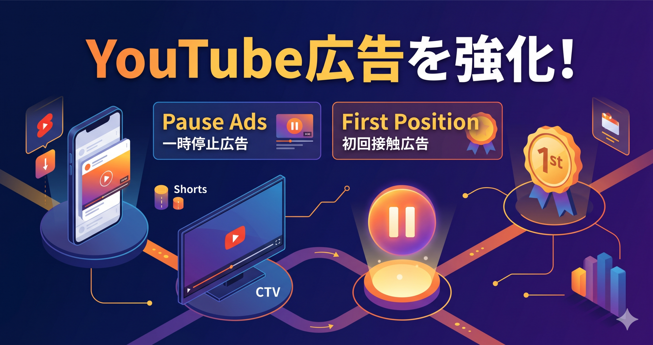 2026年のGoogle Marketing Platform関連発表では、Pause AdsのDV360導入だけでなく、YouTube Creator Takeovers、creator partnership boost、ライブスポーツ関連の買い付け強化も示されています。これは、YouTube広告が単なる動画面ではなく、クリエイター、CTV、Shorts、ライブスポーツ、停止時接点を横断する設計対象になっていることを示しています。([blog.google](https://blog.google/products/marketingplatform/360/gemini-models-advantage-google-marketing-platform/))