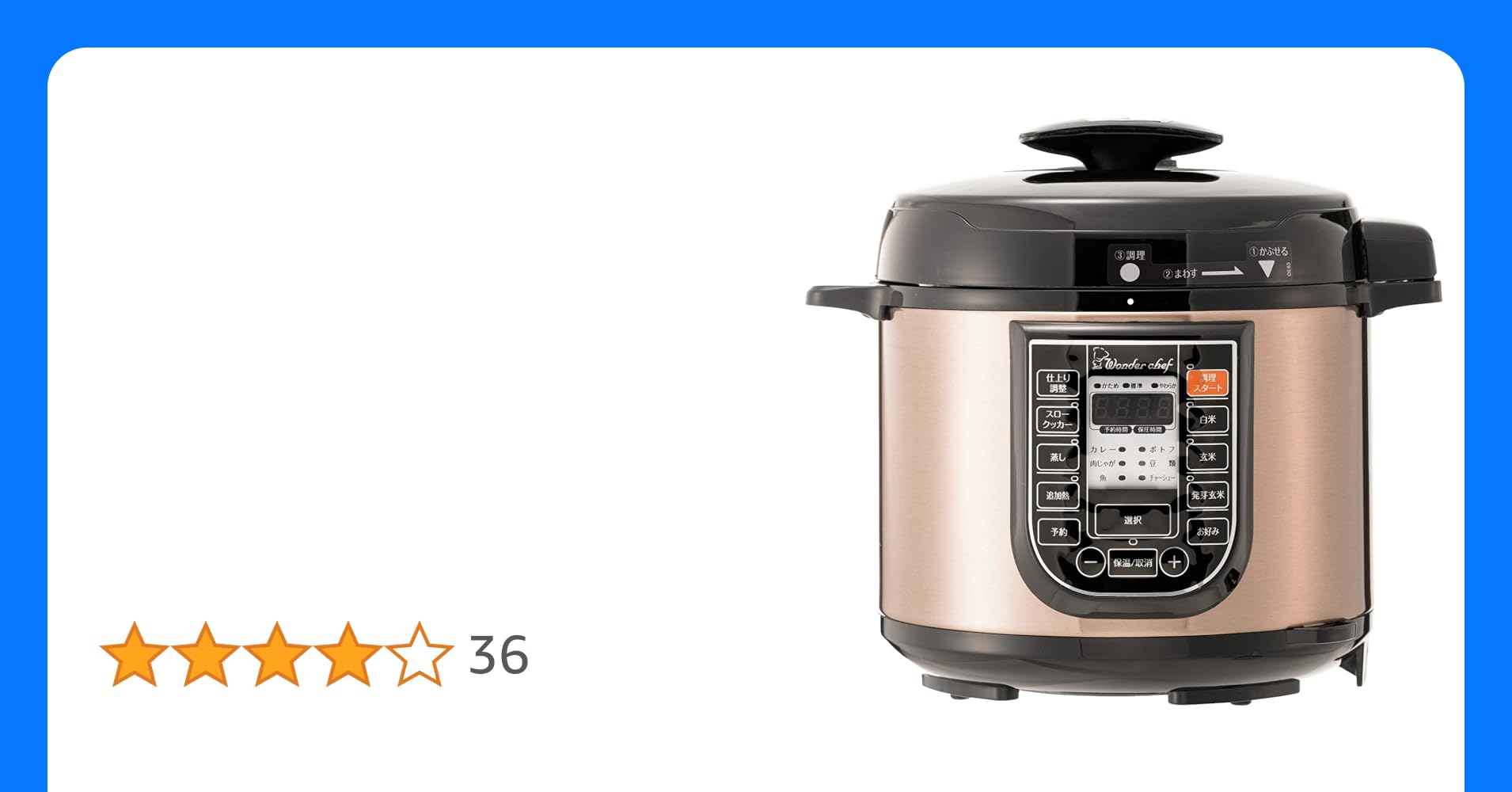 ワンダーシェフは、圧力鍋を専門に手掛ける信頼のブランド。その中でも「楽ポン」は、名前の通り「楽に、ポンと押すだけ」で使えるシンプルさを追求したモデルです。特に、カレー、肉じゃが、角煮など、日本の家庭で人気の8つのメニューがワンタッチで調理できる「オートメニューキー」は非常に便利。複雑な設定は不要で、誰でも直感的に使えます。4Lの容量は3~4人家族の毎日の食事作りに最適で、調理中の音も静かなので、小さなお子様がいるご家庭にもおすすめです。家族のために、手軽に美味しく、栄養満点の料理を作りたいと願う方のための、頼れる一台です。