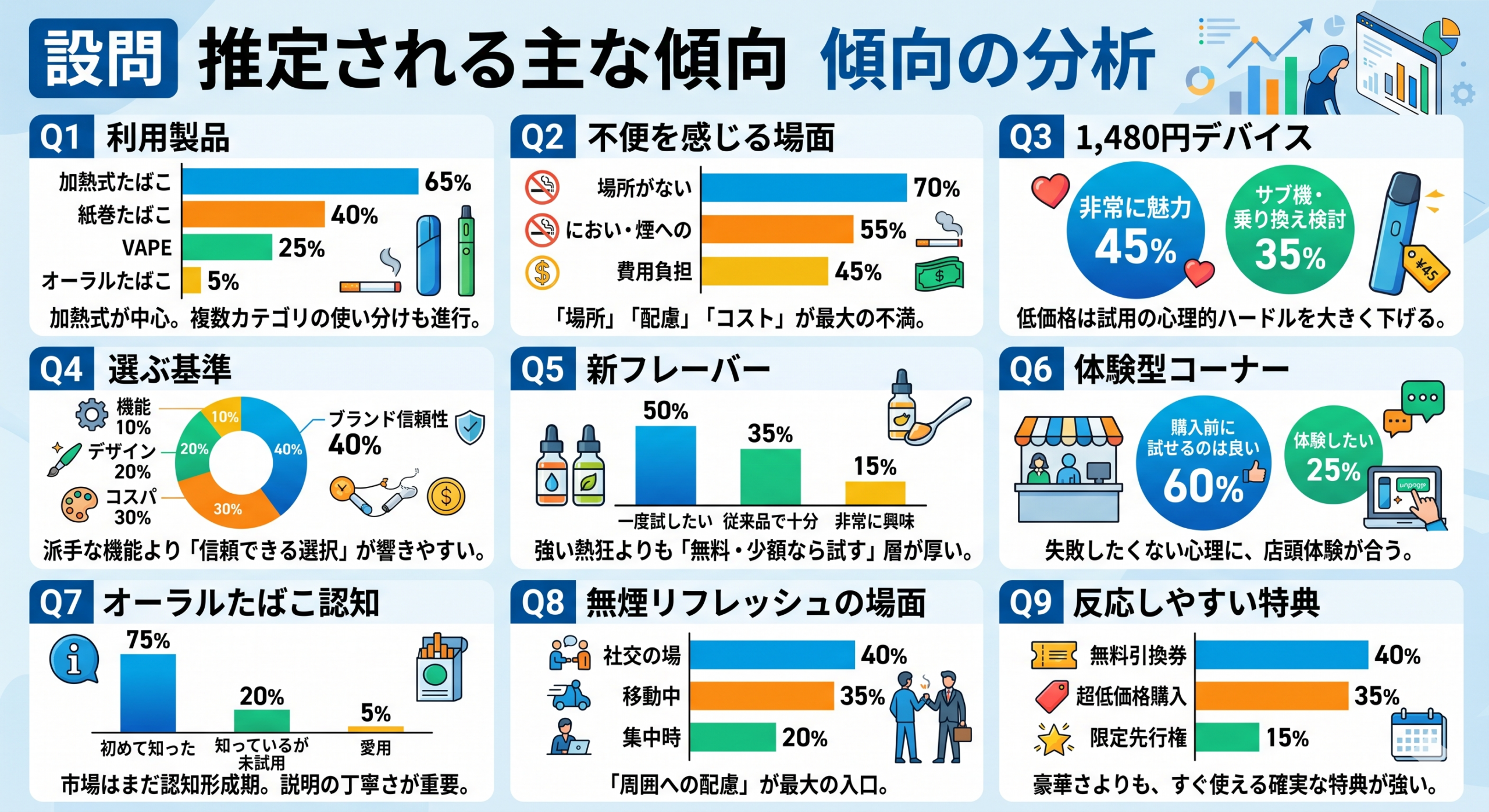 | Q1 利用製品 | 加熱式たばこ65%、紙巻たばこ40%、VAPE25%、オーラルたばこ5% | 加熱式が中心。複数カテゴリの使い分けも進行。 |
